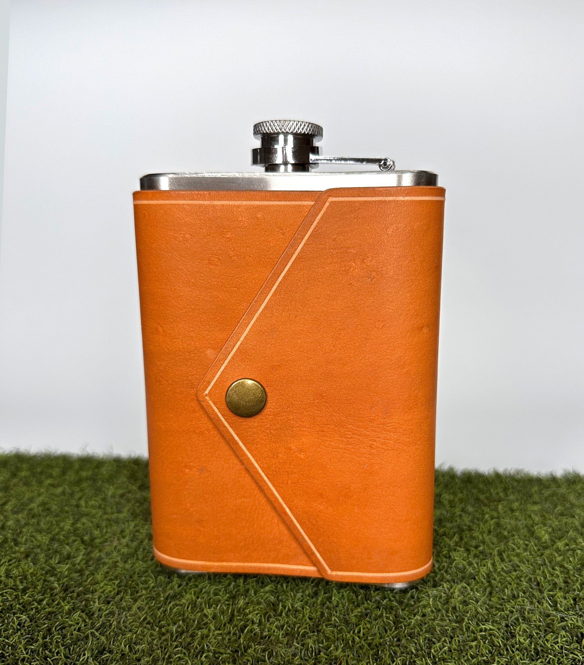 The Swing Oil "Grande" is an 8oz. stainless steel flask with our custom "envelope" engraved leather jacket with brass button closure. It makes the perfect gift or solution for those who need a "little extra oil" to loosen up their swing out on the course.