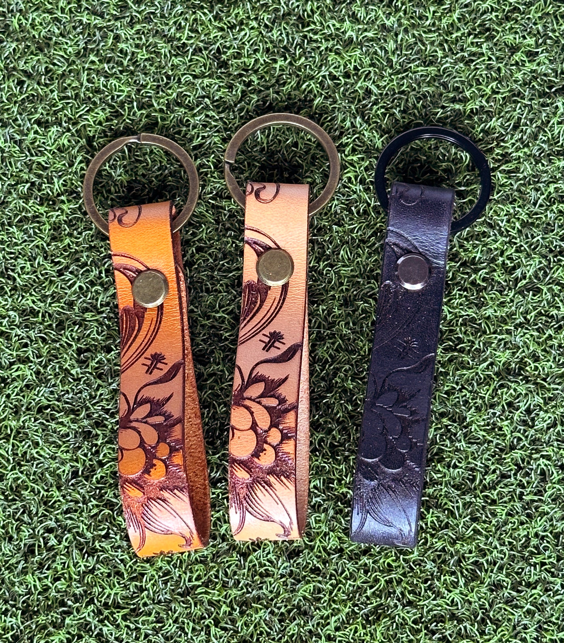 Handcrafted, veg-tan leather strap key-carrier with custom engraved "flora" design on a 1" brass keyring.